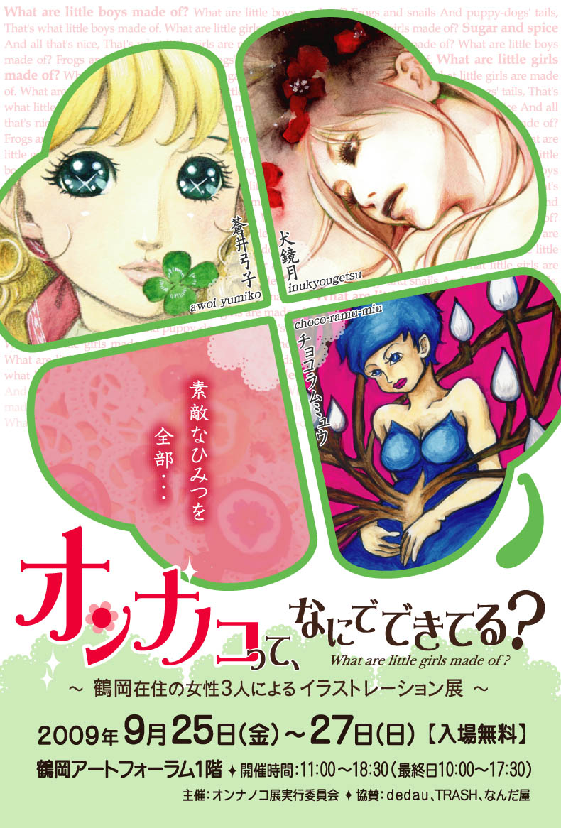 2009年9月25日~27日まで鶴岡アートフォーラムにて行われた「オンナノコって、なにでできてる?~鶴岡在住の女性3人によるイラストレーション展~」レポートです。
