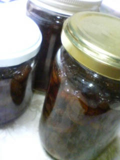 市販のレーズンを湯がいて表面の油を落とし、煮沸消毒した瓶に入れ、なみなみとラムを注ぎました。